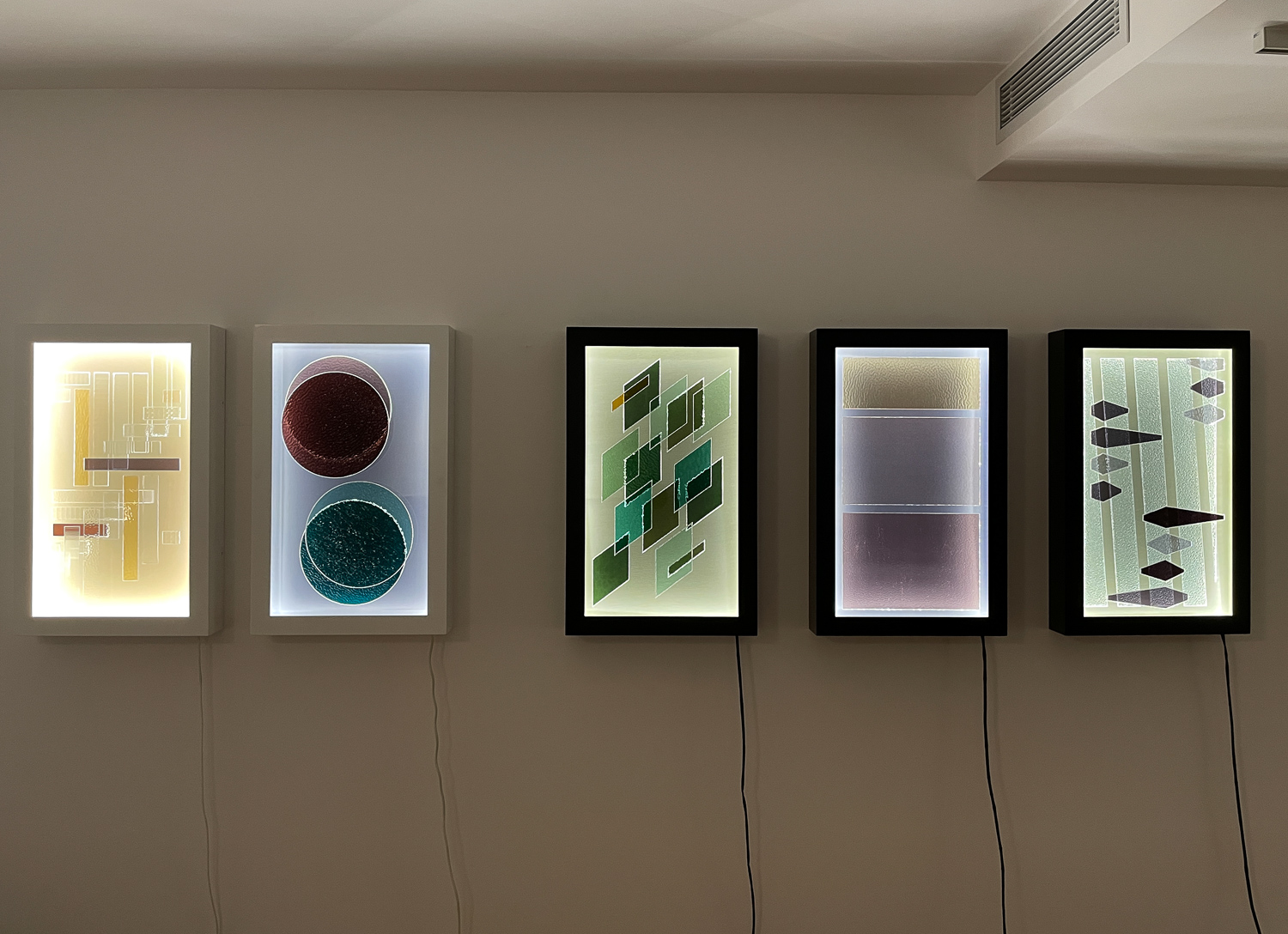This series explored dichotomies between interior and exterior spaces, intimate and shared environments and the visible vs the invisible. Ethereal and spiritual in essence, each work articulates the sensation of looking through a window, via backlit layers of overlapping glass textures.